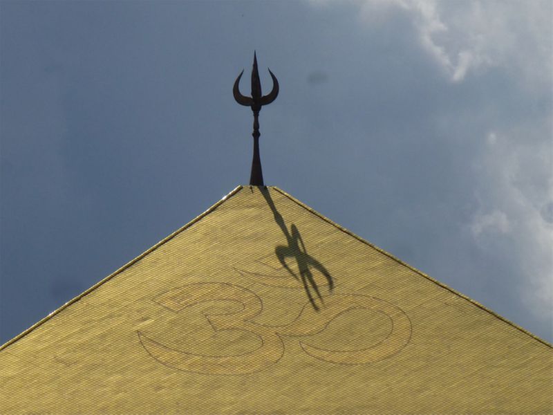 Der ‚heilige Turm‘ erhebt sich genau, nach uralter Tradition, über der ‚verborgenen Höhle‘, dem Sanktuarium von Shiva und Shakti. Wenn dieser Turmbau vollendet ist, zeigt er wie sich der höchste Kulm des Kailash erhebt über alle Götterpaläste zur Mitte des Universums. Zuoberst leuchtet das goldene Pyramidendach mit seinem einzigartigen ‚Trishul‘.